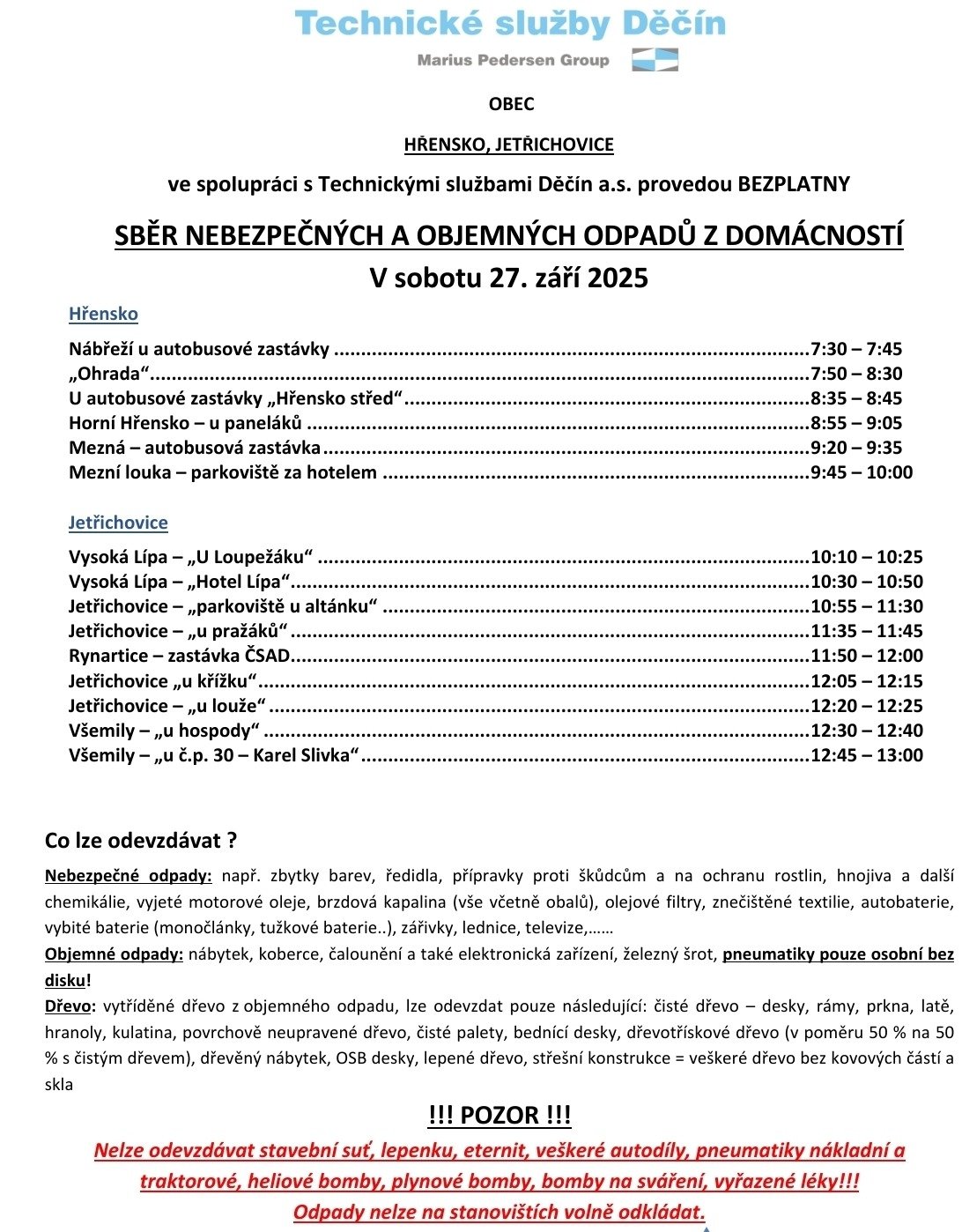 Obec Hřensko ve spolupráci s Technickými službami Děčín a.s. provedou BEZPLATNÝ