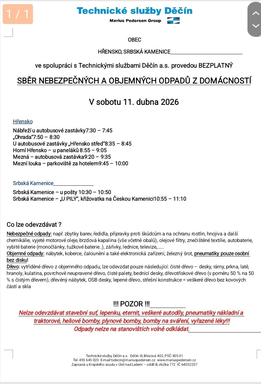 SBĚR NEBEZPEČNÝCH A OBJEMNÝCH ODPADŮ Z DOMÁCNOSTÍ V sobotu 27. září 2025
